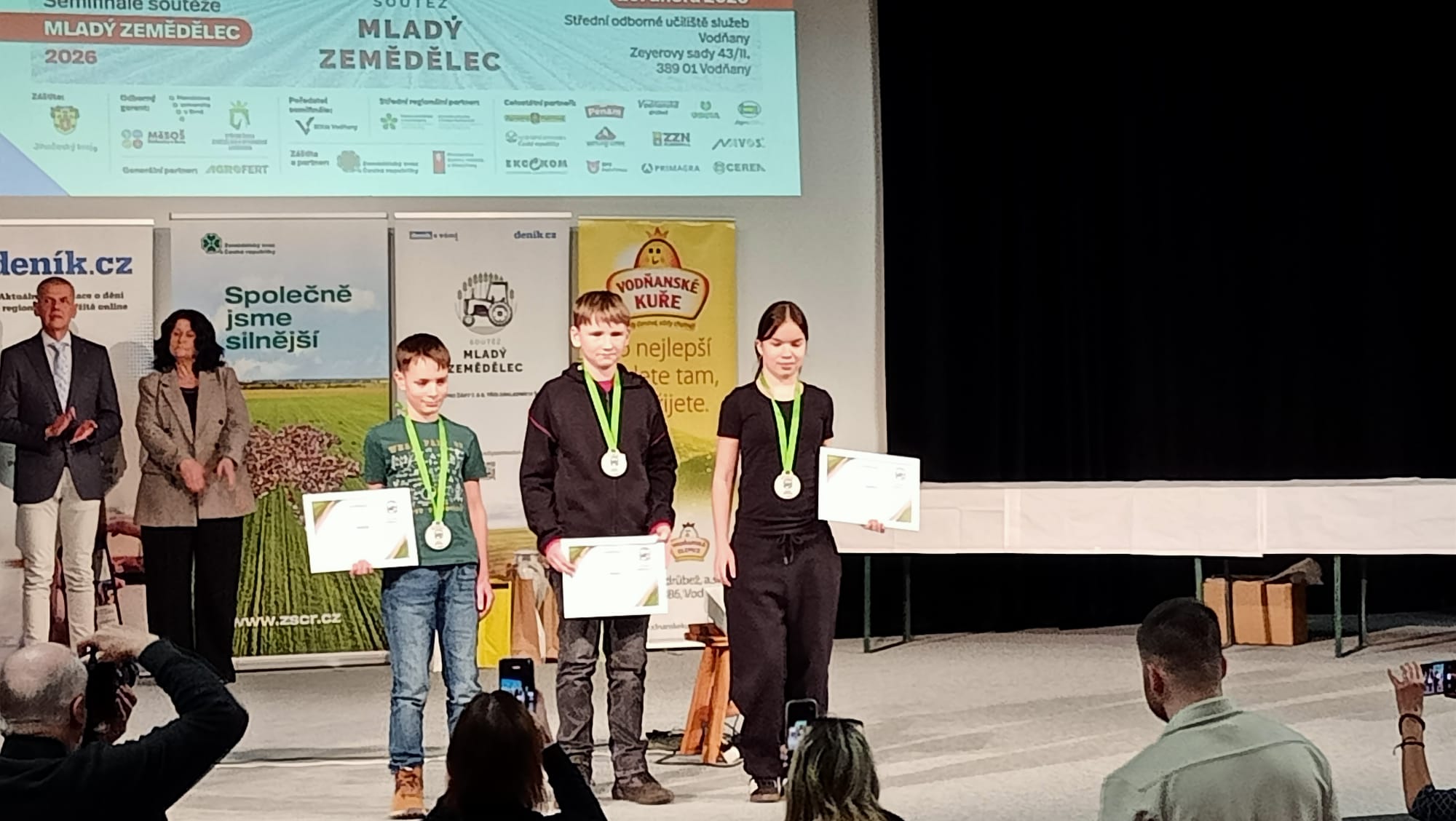 Dne 26. února 2026 se naši žáci zúčastnili semifinále Soutěže mladý zemědělec ve Vodňanech. Na soutěžní klání se sjelo 41 žáků ze 13 škol, aby změřili své síly v teoretických znalostech i praktických dovednostech. Naši školu reprezentovali Ema Malechová (VII. třída), Jasmína Kubíčková a Matouš Vodka (VIII. třída). Nejlépe si vedla Jasmína Kubíčková, která získala krásné 3. místo. Gratulujeme! Poděkování patří také Emě a Matoušovi za jejich nasazení a vzornou reprezentaci školy. Všem soutěžícím děkujeme a přejeme mnoho dalších úspěchů!