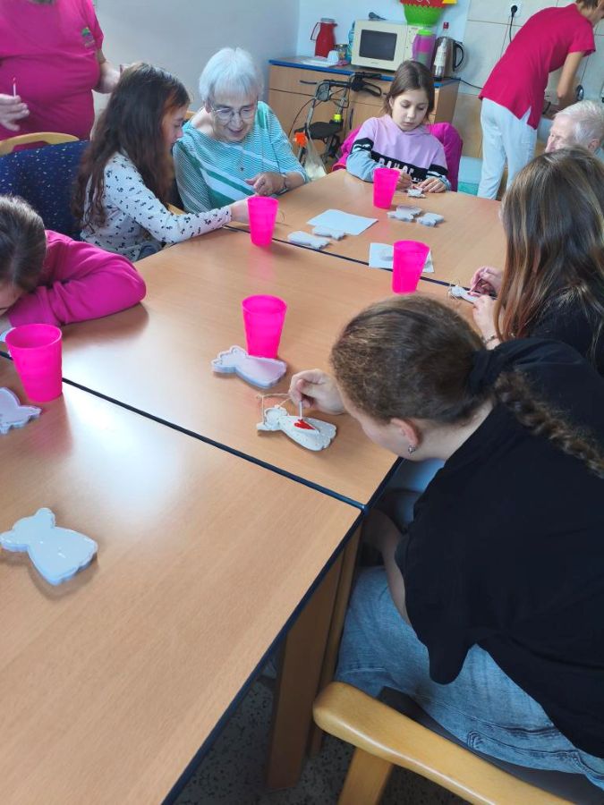 Jednu listopadovou středu jsme se v rámci projektu “Mezi námi” vydali na Dobrou Vodu za našimi babičkami, se kterými nás pojí dlouhodobá spolupráce i přátelské vztahy. Společně jsme strávili příjemné odpoledne plné tvoření, radosti a vánoční atmosféry. Hlavním programem bylo vánoční tvoření. Šikovná pracovnice DPS Vlastička Grézlová pro nás připravila silikonové formičky andělů, dřevěné špachtličky, kelímky, sádru a vodu. Pustili jsme se společně do tvoření sádrových andělíčků. Pro mnohé žáky to byla první zkušenost práce se sádrou. Vznikly překrásné výtvory, které jsme společně ozdobili barvou, korálky a provázkem. Volné chvilky jsme doplňovali slovními hrami nebo povídáním. Čas v DPS opět utekl velice rychle, ale zanechal v nás hřejivý pocit, že společně strávené chvíle mají obrovský smysl. Domů jsme si odnesli nejen vyrobené andělíčky a sladkou odměnu, ale i spoustu úsměvů a hezkých vzpomínek.
