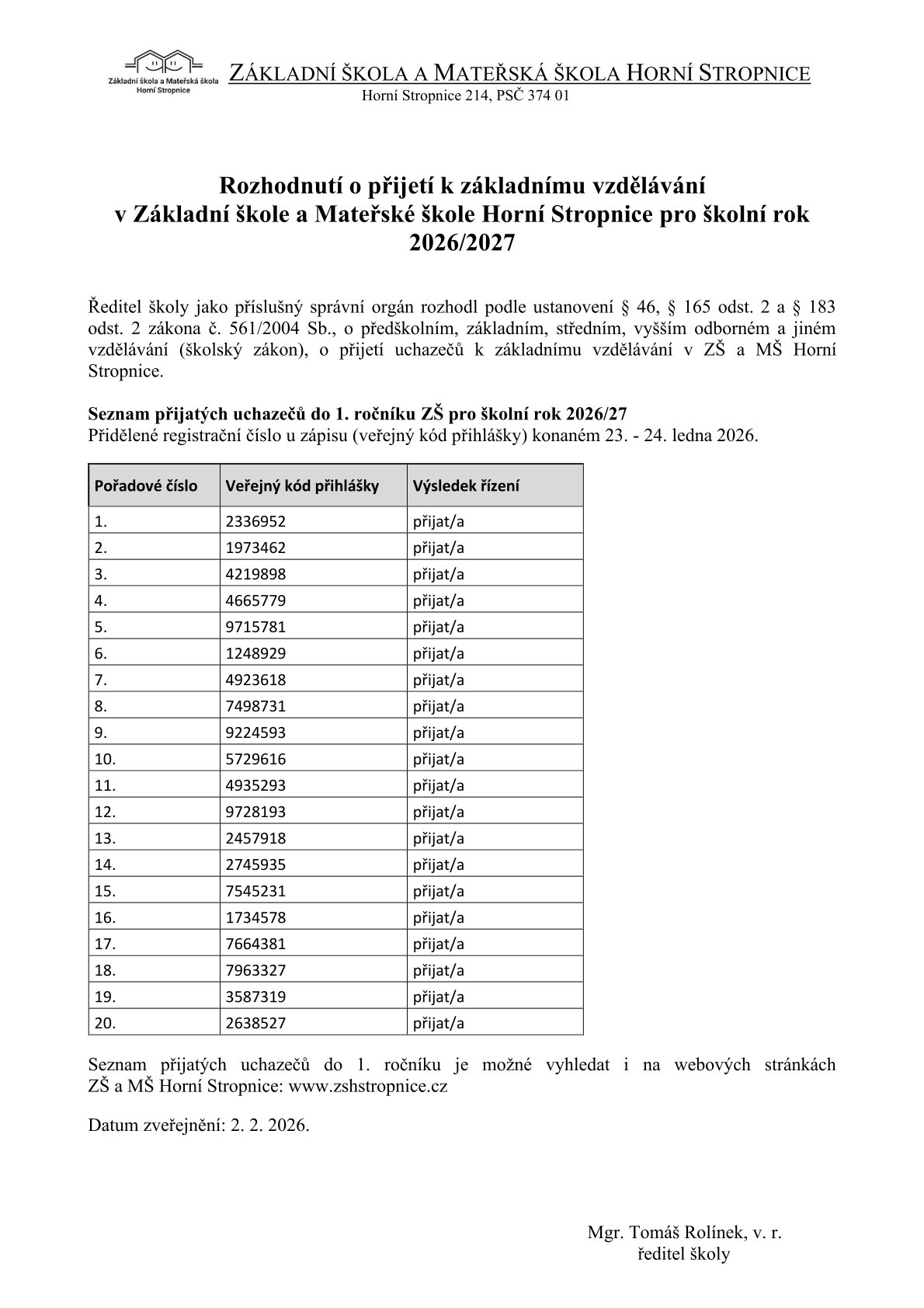Rozhodnutí o přijetí budou k vyzvednutí v kanceláři ředitele školy od 16. 2. 2026.
