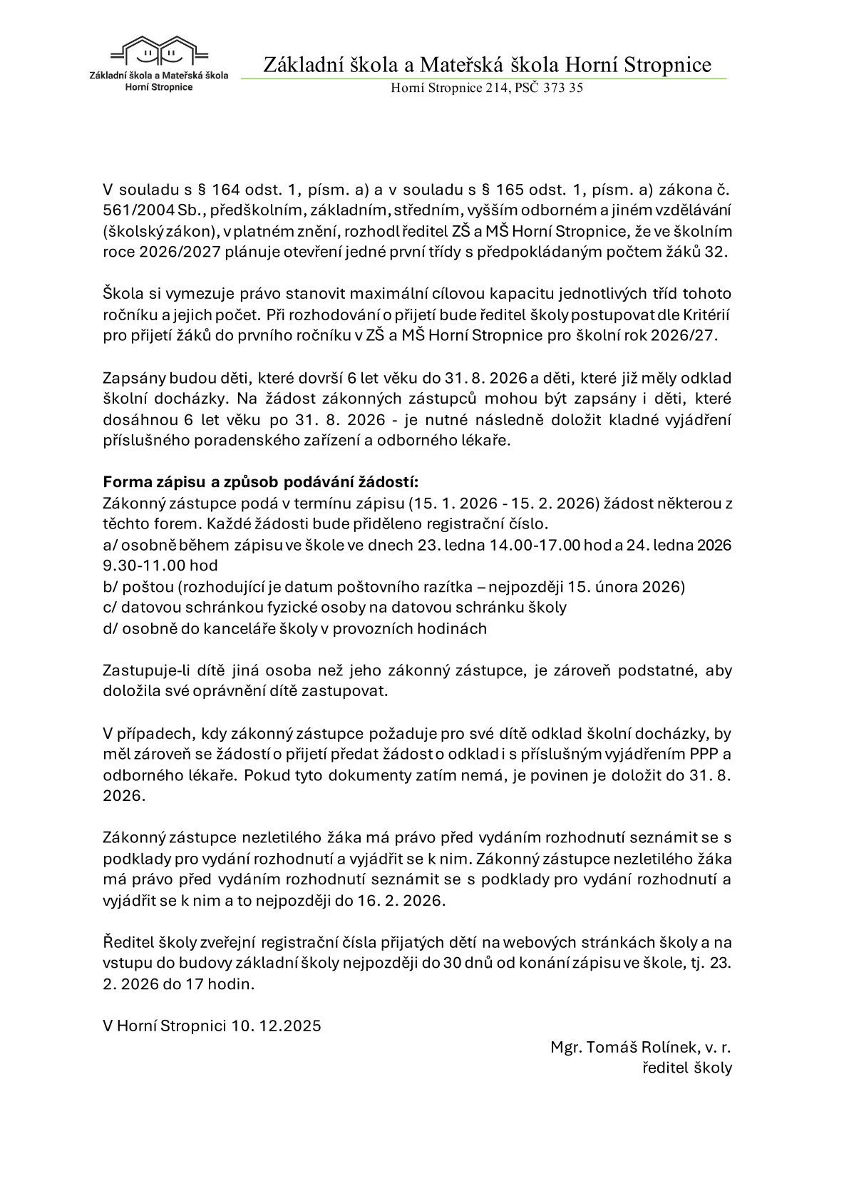 Kritéria výběru do I. ročníku pro školní rok 2026/2027