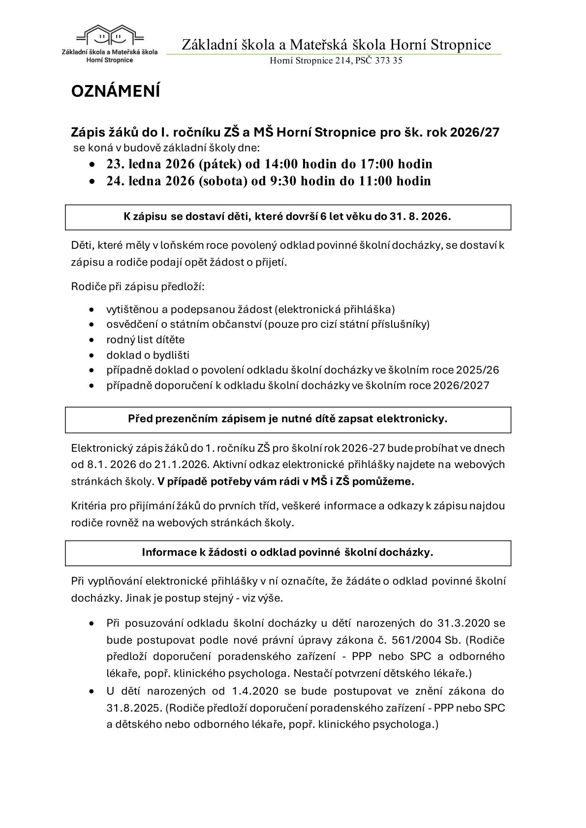 Upozornění pro rodiče žáků ZŠ, MŠ a strávníky školní jídelny