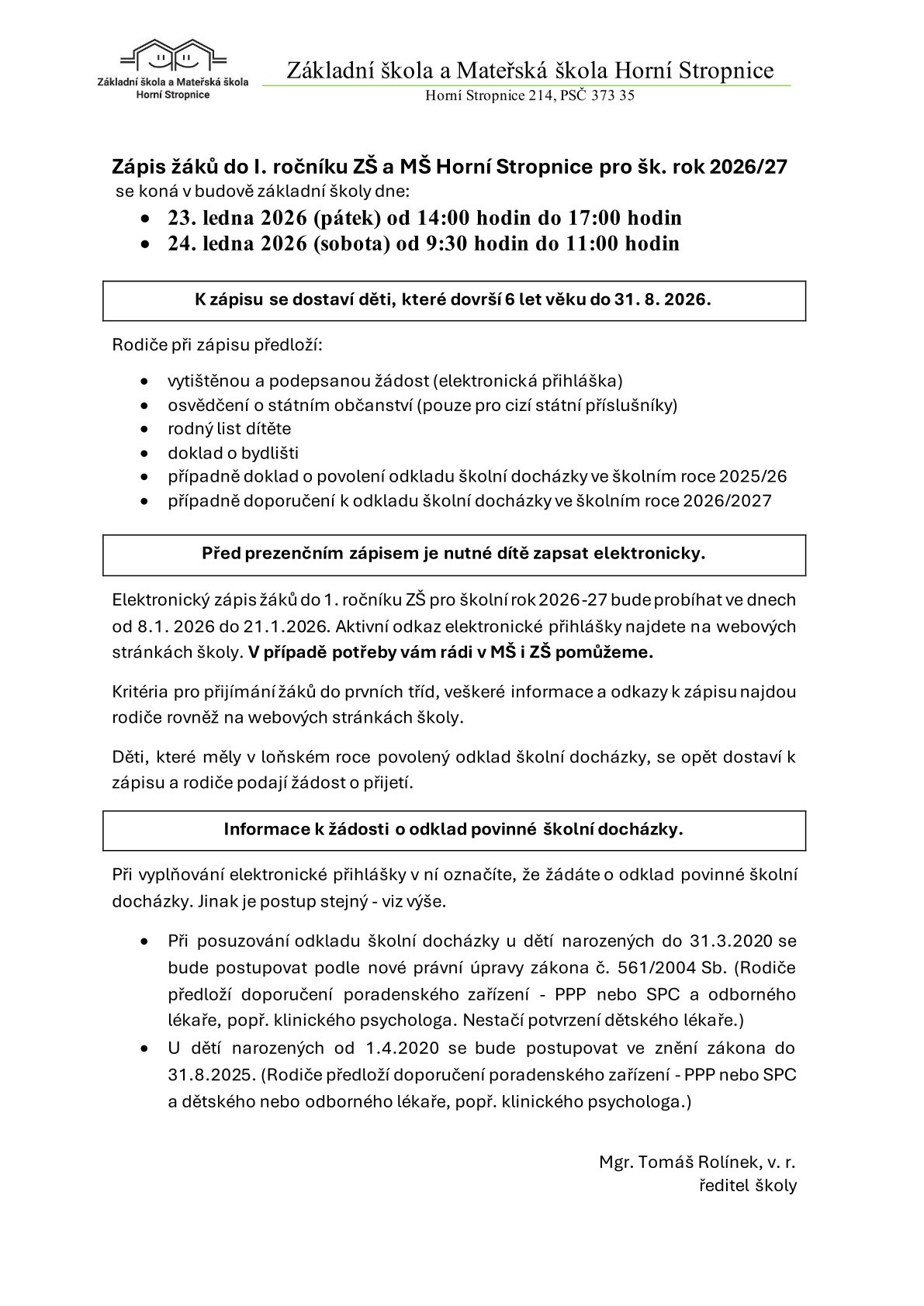 Kritéria výběru do I. ročníku pro školní rok 2026/2027